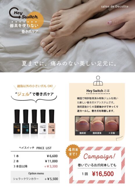 『巻き爪矯正 Hey switch 春キャンペーン🌸』 巻いているお爪が多い方、 痛みはないけど見た目が気になる方へ😌✨ 【ヘイスイッチとは?】 韓国で特許取得済み特殊ジェルを用いた新しい巻き爪ケアシステムです。 施術直後から4日前後かけてゆっくり逆カールし、巻き爪を改善します。 ジェルなので、小さいお爪もケアできるのがうれしいポイントです♡