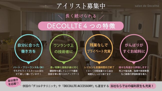 【仕事内容】 まつげカール、エクステ、人気のHBLやblow waxなどの施術を中心にお願いいたします。 ※いずれかの施術経験だけでもご応募可能です。 2026年春、新メニュー“張り付かない眉毛パーマ”も導入! 新卒からスタートするスタッフや、さらにキャリアアップを目指す経験者など、年齢も働き方もそれぞれのメンバーがともに学びながら楽しく働いています。 デコルテで「こんなことに挑戦してみたい」「こんな働き方できないかな…?」などぜひ一度ご相談ください!