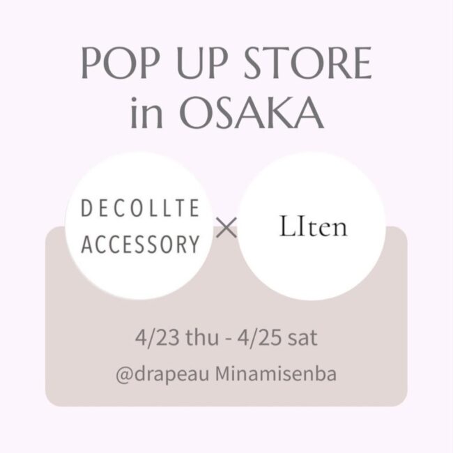 この度、大阪にて「 LIten × DECOLLTE ACCESSORY 」 POP-UP STOREを開催いたします。 LItenのお洋服と DECOLLTE ACCESSORYのアクセサリーを 実際にお手に取ってご覧いただける 特別な機会となります。 皆さまにお会いできますことを 心より楽しみにしております。